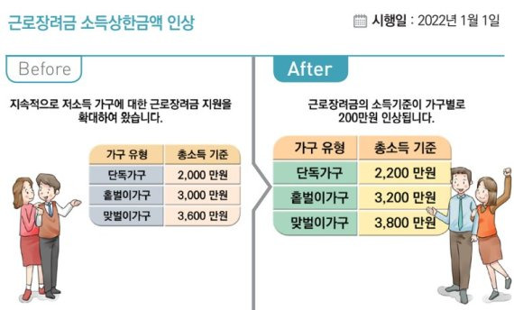 근로장려금은 가구 구성에 따라 신청 기준이 달라진다. 일반적으로 단독가구, 홑벌이 가구, 맞벌이 가구로 구분되며, 각 가구 유형별로 소득 기준이 다르게 적용된다.